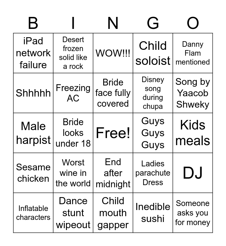 This bingo card has a free space and 24 words: Worst wine in the world, Dance stunt wipeout, Bride face fully covered, Inflatable characters, Danny Flam mentioned, iPad network failure, Shhhhh, Desert frozen solid like a rock, Guys Guys Guys, End after midnight, Disney song during chupa, Male harpist, Ladies parachute Dress, DJ, Freezing AC, Inedible sushi, Kids meals, WOW!!!, Song by Yaacob Shweky, Bride looks under 18, Someone asks you for money, Sesame chicken, Child soloist and Child mouth gapper.
