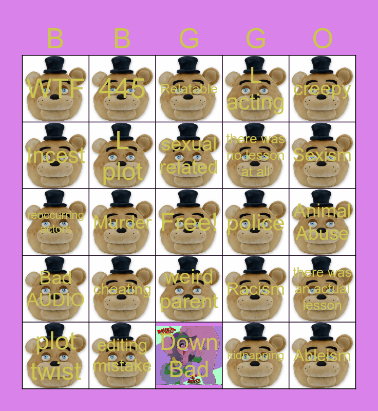 This bingo card has 24 images, a free space and 24 words: cheating, editing mistake, sexual related, plot twist, creepy, WTF, Incest, 445, police, weird parent, there was no lesson at all, reoccurring actors, Racism, there was an actual lesson, L plot, kidnapping, Animal Abuse, Relatable, Sexism, Murder, Ableism, Bad AUDIO, L acting and Down Bad.