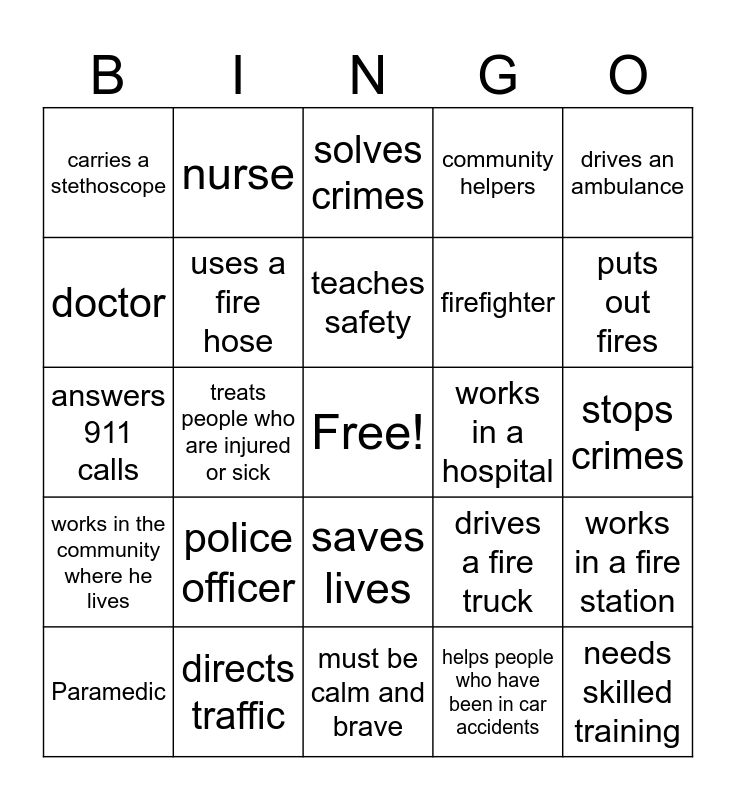 This bingo card has a free space and 24 words: police officer, directs traffic, teaches safety, Paramedic, drives an ambulance, carries a stethoscope, doctor, nurse, works in a hospital, saves lives, firefighter, answers 911 calls, drives a fire truck, works in a fire station, uses a fire hose, helps people who have been in car accidents, stops crimes, solves crimes, puts out fires, treats people who are injured or sick, needs skilled training, works in the community where he lives, community helpers and must be calm and brave.