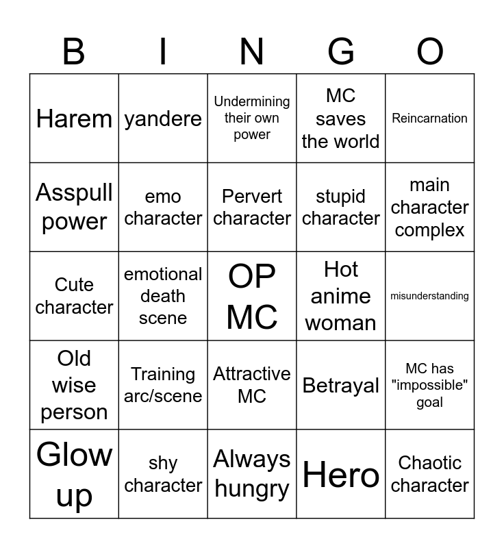 This bingo card has a free space and 24 words: Training arc/scene, shy character, Pervert character, Glow up, Reincarnation, Harem, Asspull power, yandere, Hot anime woman, Attractive MC, stupid character, Cute character, Betrayal, MC has "impossible" goal, emo character, Hero, misunderstanding, Undermining their own power, main character complex, emotional death scene, Chaotic character, Old wise person, MC saves the world and Always hungry.