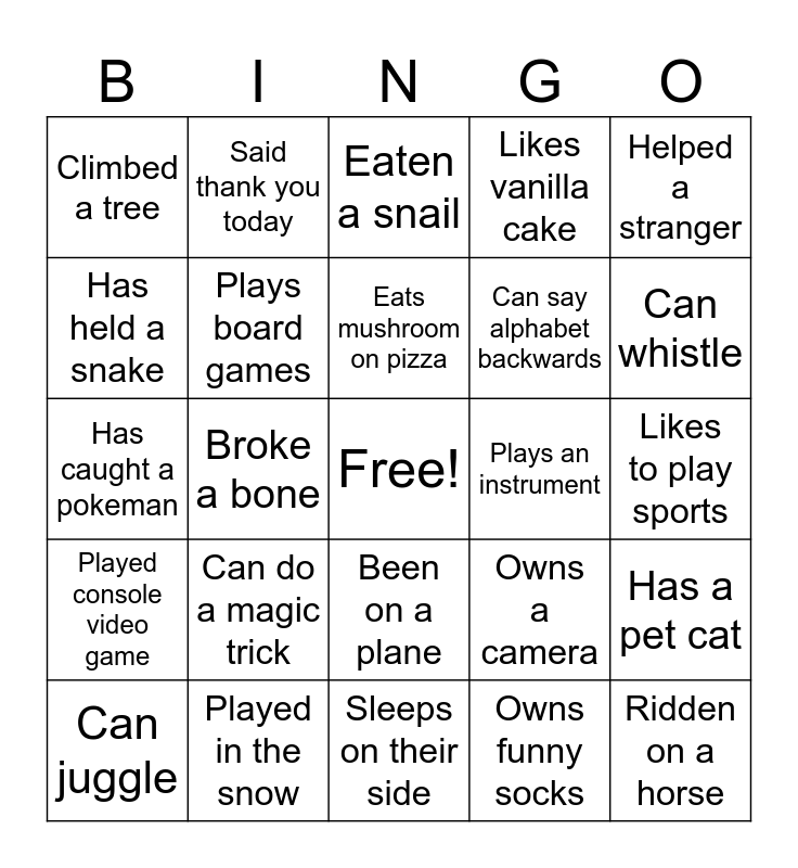 This bingo card has a free space and 52 words: Been in a food fight, Ridden on a horse, Has cowboy boots, Sleeps on their side, Can do a magic trick, Has planted a tree, Said thank you today, Can make goose sounds, Has held a snake, Can write in cursive, Plays board games, Slept in tent, Has a pet cat, Owns a camera, Performed in Public, Can bake brownies, Eats mushroom on pizza, Plays an instrument, Ate breakfast cereal today, Helped a stranger, Broke a bone, Owns funny socks, Climbed a tree, Can say alphabet backwards, Ate banana today, Has a clean bedroom, Has had stitches, Can swim under water, Can whistle, Eats asparagus, Played on trampoline, Likes vanilla cake, Can hula hoop, Is shy, Likes dogs, Eaten a snail, Played in the snow, Has roller skated, Likes to garden, Born in Ocala, Been to Canada, Likes to play sports, Played console video game, Ate vegetable(s) today, Been on a plane, Been on a cruise, Ridden a roller coaster, Has caught a pokeman, Likes salad, Likes reptiles, Can juggle and Is left handed.