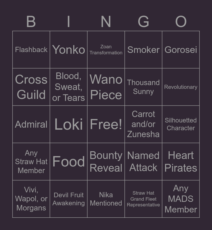 This bingo card has a free space and 29 words: Vivi, Wapol, or Morgans, Kid Pirates, Loki, New Named Devil Fruit, Flashback, Zoan Transformation, Blood, Sweat, or Tears, Food, Carrot and/or Zunesha, Devil Fruit Awakening, Silhouetted Character, Any MADS Member, Nika Mentioned, Straw Hat Grand Fleet Representative, Revolutionary, Joy Boy Mentioned, Bounty Reveal, Any Straw Hat Member, Gorosei, Admiral, Named Attack, Seraphim, Thousand Sunny, Cross Guild, Smoker, Yonko, Heart Pirates, Wano Piece and Elbaf.