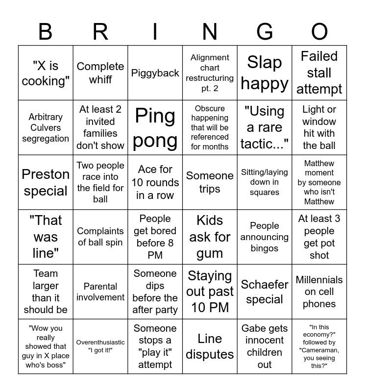 This bingo card has 66 words: Dance break, Schaefer special, Ancient chant revival, Complaints of ball spin, Parental involvement, People don't play and just talk instead, Complete whiff, Secondary ball thrown around, At least 2 invited families don't show, Elbows, Matthew moment by someone who isn't Matthew, "What a save", Ace for 10 rounds in a row, Slap happy, 3+ person team, Failed stall attempt, Light or window hit with the ball, "X is cooking", Good Memories, Ping pong, Sitting/laying down in squares, Someone trips, Alignment chart restructuring pt. 2, "Wow you really showed that guy in X place who's boss", Signature Joey grunt, Gabe gets innocent children out, Someone stops a "play it" attempt, Kicking the ball to the moon, Preston special, Sibling rivalry, People get bored before 8 PM, Surprise winning streak, Preston predicts, TV show, "That was line", Kids ask for gum, "Calculated", "Using a rare tactic...", At least 3 people get pot shot, "In this economy?" followed by "Cameraman, you seeing this?", Arbitrary Culvers segregation, Someone dips before the after party, Two people race into the field for ball, You squint to try to read what this box says since the font is super duper small and I typed way more than needed to make it as small as it currently is, Flavor of the day, Overenthusiastic "I got it!", Obscure happening that will be referenced for months, Spawncamping, Team larger than it should be, Staying out past 10 PM, Adele sings randomly, It's far colder than people expected, "Joeyyyyyy", Gender stereotypes, Someone getting boo'd by 3+ people, Millennials on cell phones, Taking things personally, Bella or Hannah randomly cooking, Piggyback, People announcing bingos, Line disputes, The youths run off to do their own thing, Line is told to move back, Brennen wears pink, Tea kettling and Unlikely duo.