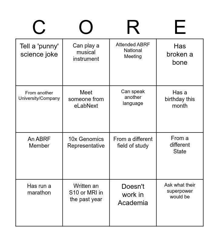 This bingo card has 20 words: From a different State, Illumina Representative, Attended ABRF National Meeting, Has a pet, Has run a marathon, From another University/Company, Written an S10 or MRI in the past year, Tell a 'punny' science joke, An ABRF Member, Can play a musical instrument, 10x Genomics Representative, From a different field of study, Meet someone from eLabNext, Ask what their superpower would be, Can speak another language, Who's favorite color is Blue, Has a birthday this month, Has broken a bone, Doesn't work in Academia and A vendor representative.