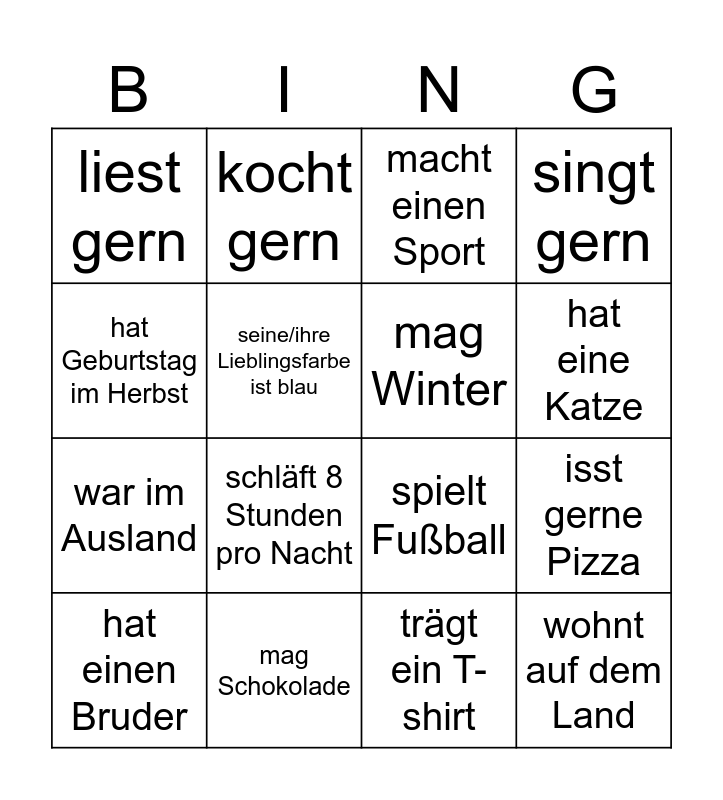 This bingo card has 16 words: mag Schokolade, isst gerne Pizza, macht einen Sport, liest gern, war im Ausland, kocht gern, spielt Fußball, trägt ein T-shirt, hat Geburtstag im Herbst, seine/ihre Lieblingsfarbe ist blau, hat einen Bruder, singt gern, schläft 8 Stunden pro Nacht, hat eine Katze, mag Winter and wohnt auf dem Land.