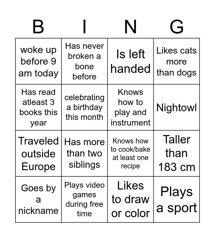 This bingo card has 16 words: Plays video games during free time, Taller than 183 cm, Is left handed, woke up before 9 am today, Traveled outside Europe, Has never broken a bone before, Knows how to cook/bake at least one recipe, Likes to draw or color, Has read atleast 3 books this year, celebrating a birthday this month, Goes by a nickname, Likes cats more than dogs, Has more than two siblings, Nightowl, Knows how to play and instrument and Plays a sport.