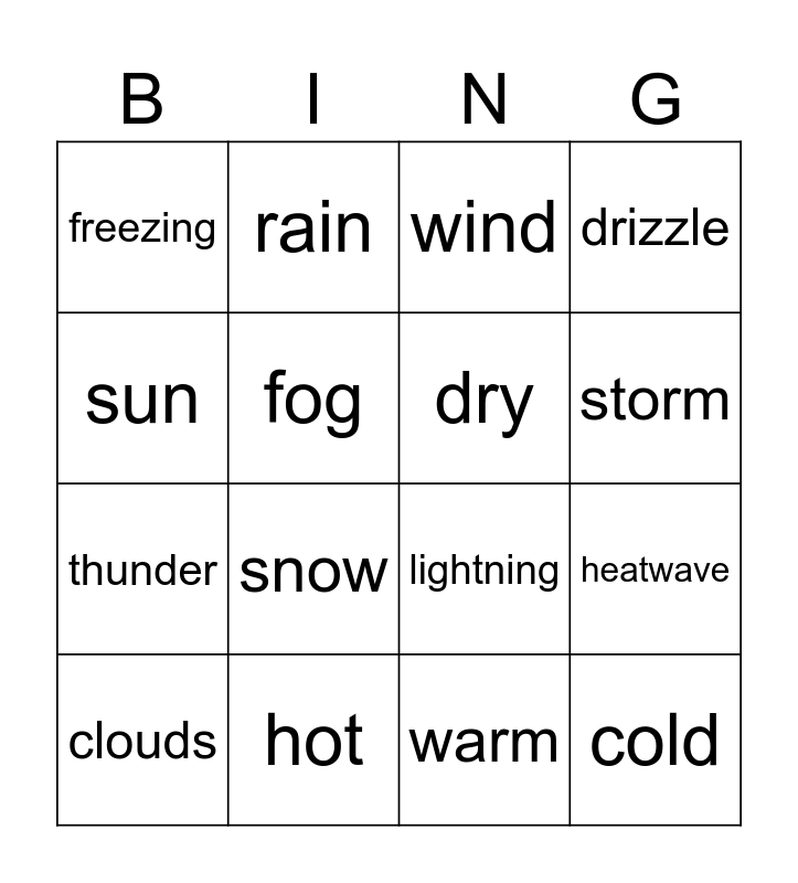 This bingo card has 16 words: hot, heatwave, wind, freezing, thunder, rain, lightning, warm, sun, fog, clouds, drizzle, snow, storm, dry and cold.