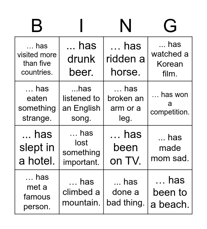 This bingo card has 16 words: … has climbed a mountain., ... has made mom sad., … has ridden a horse., … has visited more than five countries., ... has slept in a hotel., ... has drunk beer., … has been on TV., ... has done a bad thing., … has eaten something strange., ...has listened to an English song., … has met a famous person., ... has watched a Korean film., … has lost something important., … has won a competition., … has broken an arm or a leg. and … has been to a beach..