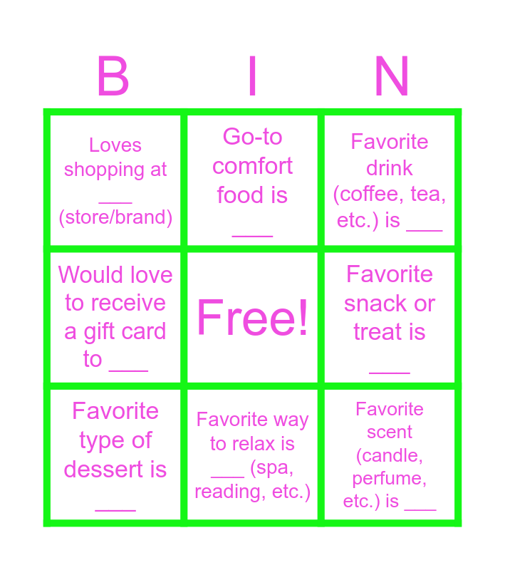 This bingo card has a free space and 8 words: Favorite snack or treat is ___, Favorite drink (coffee, tea, etc.) is ___, Go-to comfort food is ___, Favorite type of dessert is ___, Loves shopping at ___ (store/brand), Favorite scent (candle, perfume, etc.) is ___, Would love to receive a gift card to ___ and Favorite way to relax is ___ (spa, reading, etc.).
