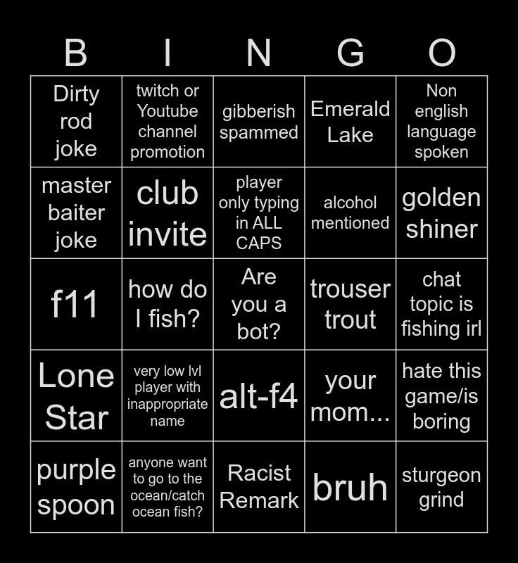 This bingo card has a free space and 24 words: very low lvl player with inappropriate name, anyone want to go to the ocean/catch ocean fish?, player only typing in ALL CAPS, purple spoon, Non english language spoken, Dirty rod joke, master baiter joke, twitch or Youtube channel promotion, trouser trout, alt-f4, alcohol mentioned, f11, your mom..., hate this game/is boring, club invite, bruh, chat topic is fishing irl, gibberish spammed, golden shiner, how do I fish?, sturgeon grind, Lone Star, Emerald Lake and Racist Remark.