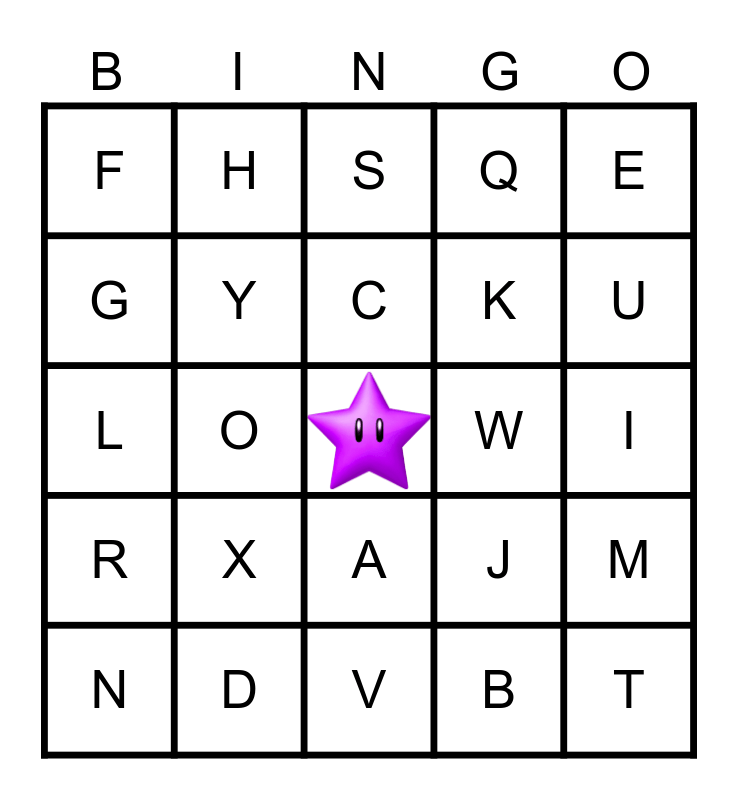 This bingo card has a free space and 26 words: A, B, C, D, E, F, G, H, I, J, K, L, M, N, O, P, Q, R, S, T, U, V, W, X, Y and Z.