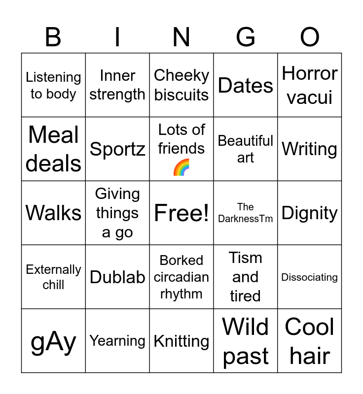 This bingo card has a free space and 24 words: Dublab, Yearning, Lots of friends 🌈, gAy, Horror vacui, Listening to body, Meal deals, Inner strength, The DarknessTm, Borked circadian rhythm, Beautiful art, Walks, Tism and tired, Dissociating, Sportz, Wild past, Dignity, Cheeky biscuits, Writing, Giving things a go, Cool hair, Externally chill, Dates and Knitting.