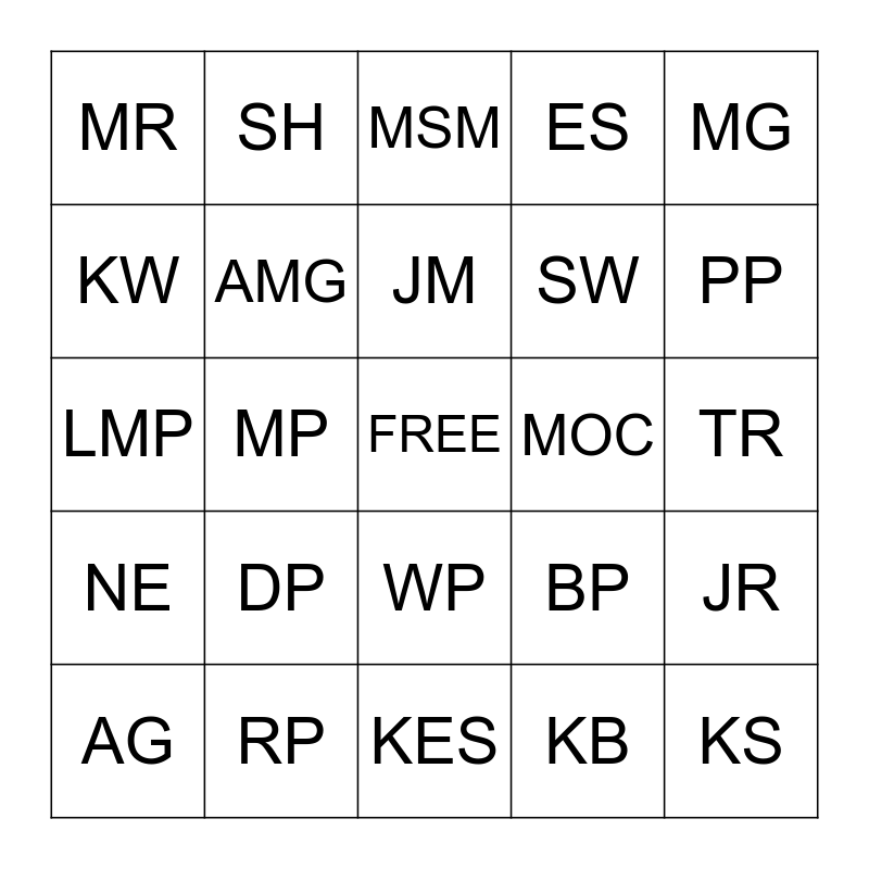 This bingo card has a free space and 34 words: KRB, KB, TMB, SC, NE, AMG, MG, AG, SH, MMD, JM, MSM, CM, EOC, MOC, PP, RP, LMP, DP, BP, WP, ZR, MR, TR, KES, KS, ES, CV, SW, KW, NW, MP, JR and SR.