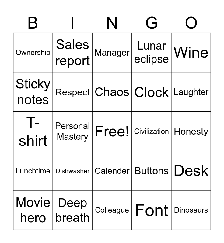 This bingo card has a free space and 29 words: Movie hero, Printer, Personal Mastery, Engineer, Ownership, Manager, Respect, Dishwasher, Civilization, Deep breath, Honesty, Dinosaurs, Colleague, Font, Laughter, Passion for winning, Calender, Lunchtime, Wine, T-shirt, Buttons, Coffee machine, Clock, Sticky notes, Lunar eclipse, Sales report, Desk, Chaos and Training.