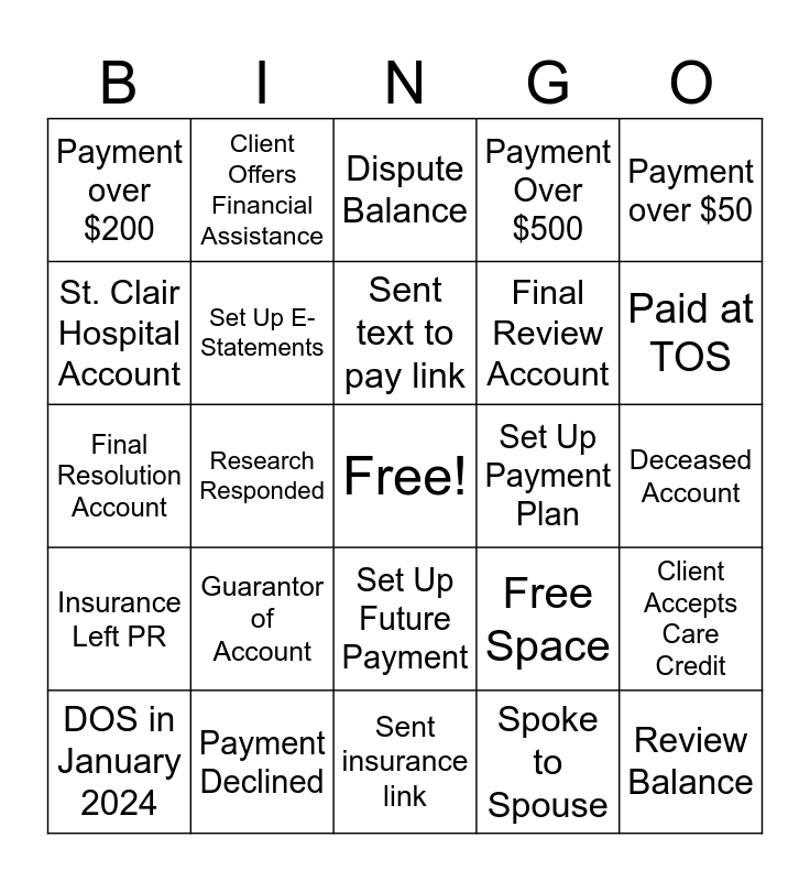 This bingo card has a free space and 25 words: Guarantor of Account, Sent insurance link, Sent text to pay link, DOS in January 2024, Payment over $50, Payment over $200, St. Clair Hospital Account, Client Offers Financial Assistance, Set Up Payment Plan, Set Up Future Payment, Final Review Account, Final Resolution Account, Free Space, Client Accepts Care Credit, Set Up E-Statements, Balance Over $1000, Deceased Account, Dispute Balance, Paid at TOS, Research Responded, Review Balance, Payment Declined, Insurance Left PR, Payment Over $500 and Spoke to Spouse.