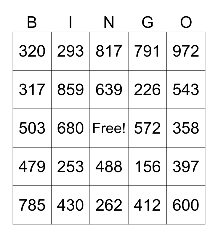This bingo card has a free space and 24 words: 253, 430, 639, 785, 972, 320, 317, 293, 572, 488, 226, 503, 156, 397, 859, 412, 358, 817, 543, 680, 600, 479, 791 and 262.