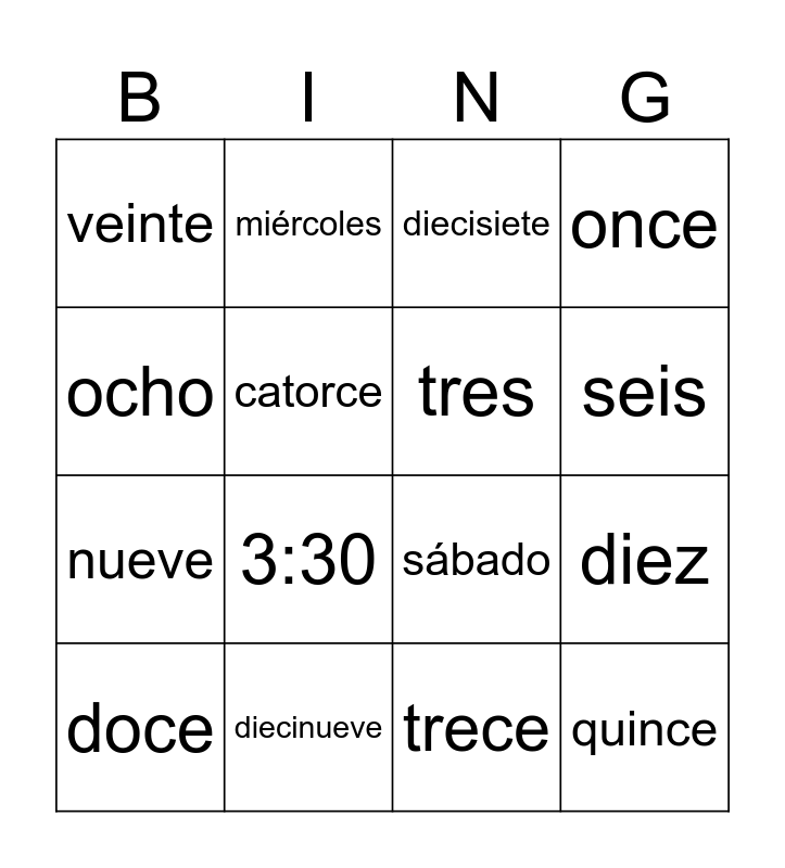 This bingo card has 38 words: cero, uno, dos, tres, cuatro, cinco, seis, siete, ocho, nueve, diez, once, doce, trece, catorce, quince, dieciséis, diecisiete, dieciocho, diecinueve, veinte, 2:15, 3:30, 4:00, 4:45, 6:10, 8:00, 9:30, 9:40, 11:15, 12:00, lunes, martes, miércoles, jueves, viernes, sábado and domingo.