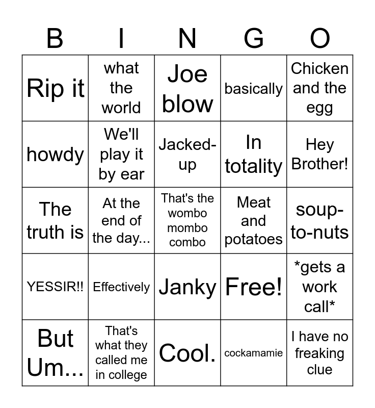 This bingo card has 25 words: Effectively, Cool., Jacked-up, But Um..., Chicken and the egg, Rip it, howdy, what the world, Meat and potatoes, Janky, In totality, The truth is, Free!, *gets a work call*, We'll play it by ear, I have no freaking clue, soup-to-nuts, Joe blow, Hey Brother!, At the end of the day..., That's the wombo mombo combo, That's what they called me in college, YESSIR!!, basically and cockamamie.