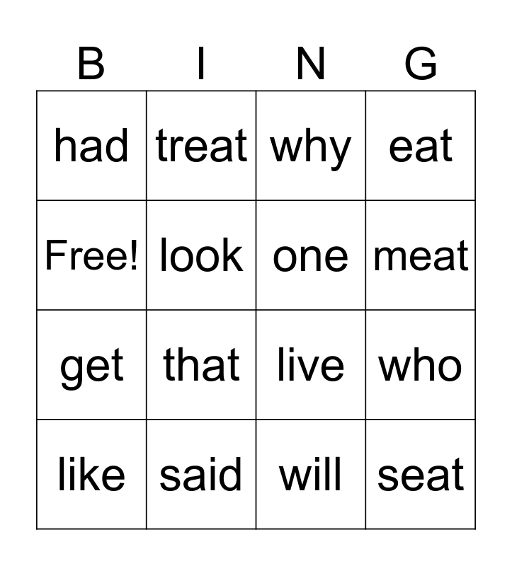 This bingo card has 16 words: said, who, why, had, get, treat, live, will, Free!, look, like, eat, that, meat, one and seat.