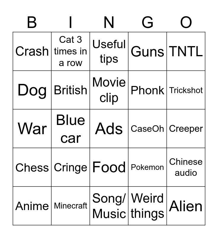 This bingo card has a free space and 24 words: Cringe, Minecraft, Movie clip, Anime, TNTL, Crash, Dog, Cat 3 times in a row, CaseOh, Food, Phonk, War, Pokemon, Chinese audio, British, Weird things, Creeper, Useful tips, Trickshot, Blue car, Alien, Chess, Guns and Song/ Music.