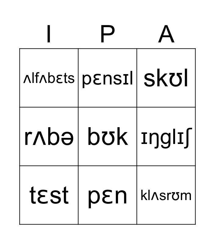 This bingo card has 9 words: tɛst, skʊl, pɛnsɪl, rʌbə, ʌlfʌbɛts, ɪŋglɪʃ, bʊk, klʌsrʊm and pɛn.
