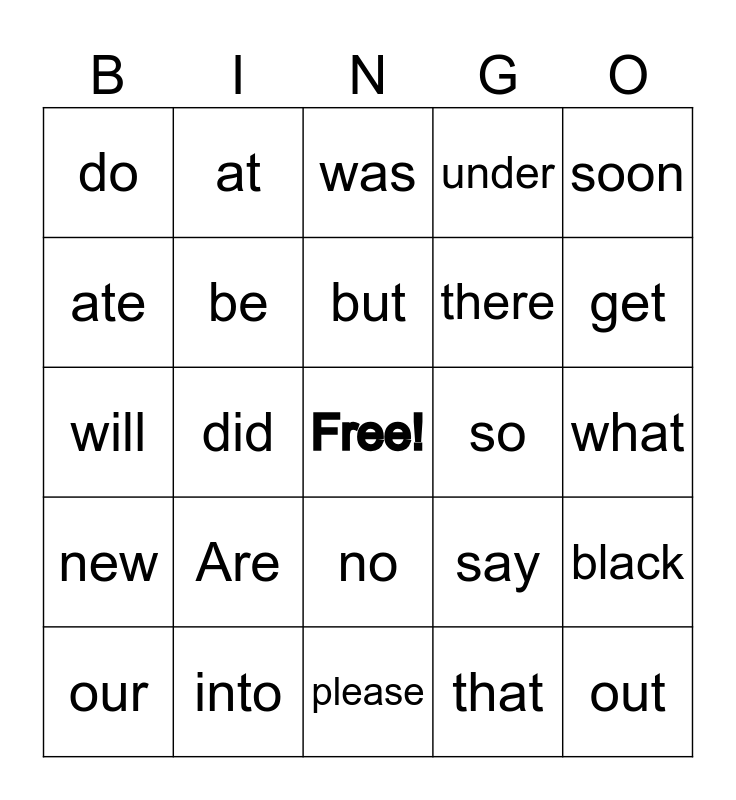 This bingo card has a free space and 52 words: all, out, am, please, Are, pretty, at, ran, ate, ride, be, saw, black, say, brown, she, but, so, came, soon, did, that, do, there, eat, they, four, this, get, too, good, under, have, want, he, was, into, well, like, went, must, what, new, white, no, who, now, will, on, with, our and yes.