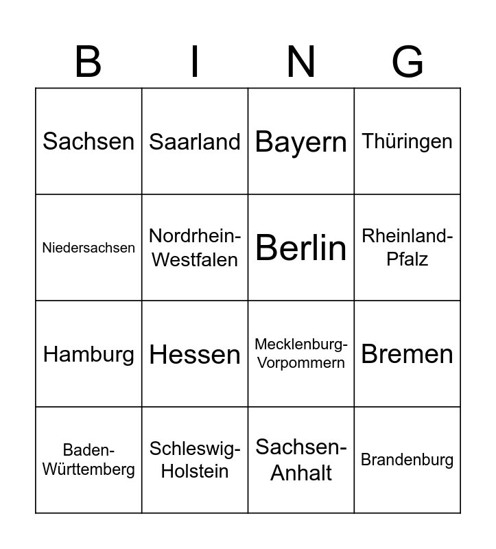 This bingo card has 16 words: Schleswig-Holstein, Bremen, Bayern, Sachsen, Hamburg, Saarland, Mecklenburg-Vorpommern, Sachsen-Anhalt, Niedersachsen, Nordrhein-Westfalen, Baden-Württemberg, Thüringen, Hessen, Rheinland-Pfalz, Berlin and Brandenburg.