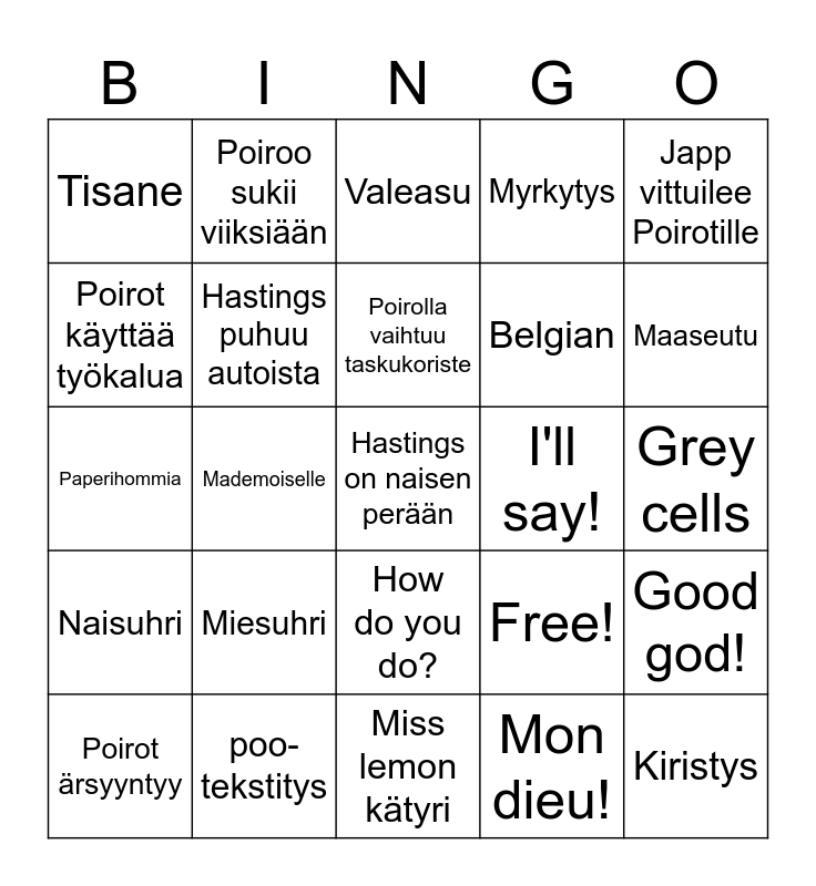 This bingo card has 25 words: Miesuhri, Miss lemon kätyri, Poirolla vaihtuu taskukoriste, Poirot ärsyyntyy, Japp vittuilee Poirotille, Tisane, Poirot käyttää työkalua, Poiroo sukii viiksiään, I'll say!, How do you do?, Belgian, Paperihommia, Free!, Good god!, Hastings puhuu autoista, Kiristys, Grey cells, Valeasu, Maaseutu, Mademoiselle, Hastings on naisen perään, poo- tekstitys, Naisuhri, Myrkytys and Mon dieu!.