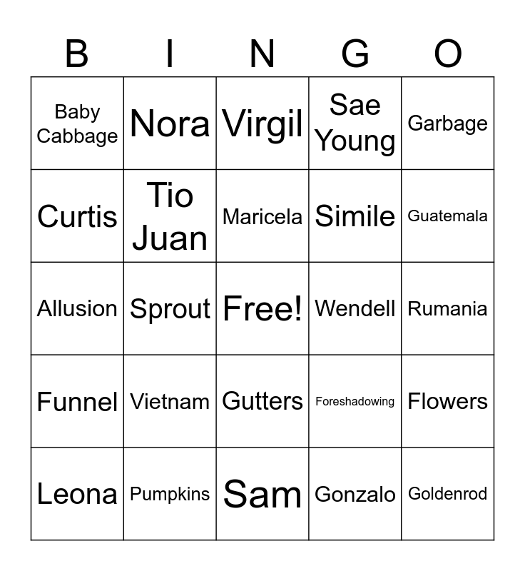 This bingo card has a free space and 29 words: Leona, Maggots, Sprout, Lima Beans, Baby Cabbage, Virgil, Tio Juan, Vietnam, Wendell, Pumpkins, Rumania, Goldenrod, Sam, Gonzalo, Guatemala, Pueblo, Gutters, Funnel, Garbage, Allusion, Foreshadowing, Metaphor, Simile, Curtis, Sae Young, Nora, Flowers, Maricela and Amir.