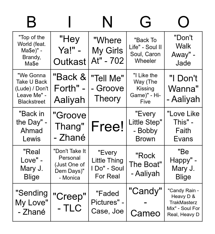 This bingo card has a free space and 40 words: "Shy Guy" - Diana King, "Back in the Day" - Ahmad Lewis, "Hey Mr. D.J." - Zhané, "Back & Forth" - Aaliyah, "Creep" - TLC, "Every Little Thing I Do" - Soul For Real, "Tell Me" - Groove Theory, "Right Here - Human Nature Radio Mix" - SWV, "Don't Walk Away" - Jade, "Real Love" - Mary J. Blige, "Groove Thang" - Zhané, "Back To Life" - Soul II Soul, Caron Wheeler, "Candy Rain - Heavy D & TrakMasterz Mix" - Soul For Real, Heavy D, "Love Like This" - Faith Evans, "Every Little Step" - Bobby Brown, "Don't Take It Personal (Just One of Dem Days)" - Monica, "I'm So Into You" - SWV, "Top of the World (feat. Ma$e)" - Brandy, Ma$e, "You Make Me Wanna..." - Usher, "Where My Girls At" - 702, "Be Happy" - Mary J. Blige, "Candy" - Cameo, "I Like the Way (The Kissing Game)" - Hi-Five, "We Gonna Take U Back (Lude) / Don't Leave Me" - Blackstreet, "Nite and Day" - Al B. Sure!, "Sensitivity" - Ralph Tresvant, "Just in Case" - Jaheim, "Hit Me Off" - New Edition, "Just Fine" - Mary J. Blige, "Twisted" - Keith Sweat, "If It Isn't Love" - New Edition, "Sending My Love" - Zhané, "Baby-Baby-Baby" - TLC, "Rock The Boat" - Aaliyah, "I Don't Wanna" - Aaliyah, "Faded Pictures" - Case, Joe, "What About Your Friends" - TLC, "Rollout (My Business) - Album Version (Edited)" - Ludacris, "Hey Ya!" - Outkast and "U Can't Touch This" - MC Hammer.