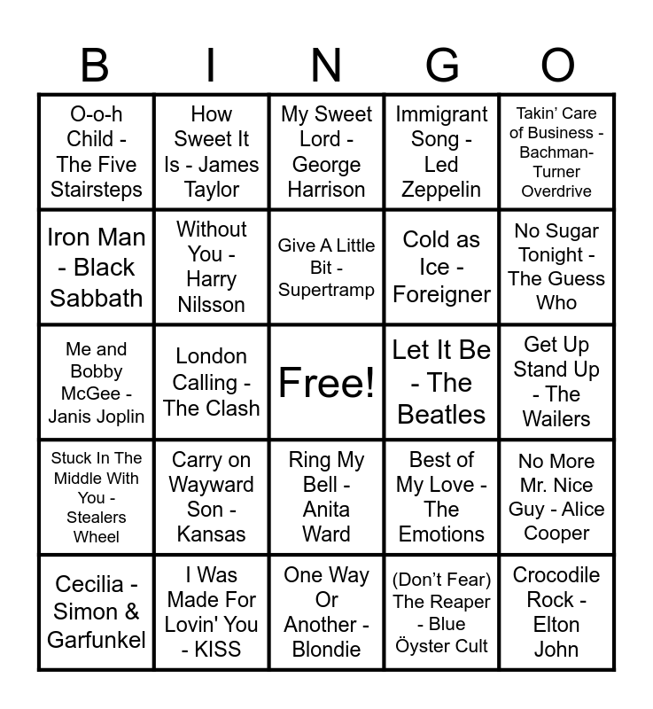 This bingo card has a free space and 84 words: Top Of The World - Carpenters, You’re so Vain - Carly Simon, My Sweet Lord - George Harrison, Burning Love - Elvis Presley, Gypsys Tramps & Thieves - Cher, Piano Man - Billy Joel, Don't Stop Me Now - Queen, Heart of Gold - Neil Young, Rock with You - Michael Jackson, You Sexy Thing - Hot Chocolate, Baba O'Riley - The Who, Voulez-Vous - ABBA, Without You - Harry Nilsson, Let It Be - The Beatles, Runnin' with the Devil - Van Halen, O-o-h Child - The Five Stairsteps, Cecilia - Simon & Garfunkel, Iron Man - Black Sabbath, The Night the Lights Went Out - Vicki Lawrence, Gold - John Stewart, More Than A Feeling - Boston, Cold as Ice - Foreigner, Crocodile Rock - Elton John, Dream On - Aerosmith, London Calling - The Clash, Some Kind Of Wonderful - Grand Funk Railroad, Time - Pink Floyd, Vincent - Don McLean, Dreams - Fleetwood Mac, Come and Get Your Love - Redbone, Carry on Wayward Son - Kansas, АВС - The Jackson 5, Barracuda - Heart, Me and Bobby McGee - Janis Joplin, Hotel California - Eagles, Y.M.C.A. - Village People, One Way Or Another - Blondie, Hooked On A Feeling - Blue Swede, No Sugar Tonight - The Guess Who, Stuck In The Middle With You - Stealers Wheel, Beast Of Burden - The Rolling Stones, Hold the Line - TOTO, Low Rider - War, Sweet Home Alabama - Lynyrd Skynyrd, Bad Bad Leroy Brown - Jim Croce, You Make Me Feel Like Dancing - Leo Sayer, How Sweet It Is - James Taylor, September - Earth Wind & Fire, Do That To Me One More Time - Captain & Tennille, Jolene - Dolly Parton, Midnight Train to Georgia - Gladys Knight & The Pips, Best of My Love - The Emotions, Immigrant Song - Led Zeppelin, Rich Girl - Daryl Hall & John Oates, Listen to the Music The Doobie Brothers, Ain’t No Sunshine - Bill Weathers, I Was Made For Lovin' You - KISS, Give A Little Bit - Supertramp, Free Ride - The Edgar Winter Group, Get Up Stand Up - The Wailers, Evil Woman - Electric Light Orchestra, That's the Way (I Like It) - K & The Sunshine Band, War - Edwin Starr, I Am Woman - Helen Reddy, Me and Mrs. Jones - Billy Paul, Ooh La La - Faces, I Can See Clearly Now - Johnny Nash, Big Yellow Taxi - Joni Mitchell, Takin’ Care of Business - Bachman-Turner Overdrive, Have You Ever Seen The Rain - Creedence Clearwater Revival, No More Mr. Nice Guy - Alice Cooper, Sundown - Gordon Lightfoot, Stayin Alive - Bee Gees, It’s A Long Way to the Top - AC/DC, Ring My Bell - Anita Ward, (Don’t Fear) The Reaper - Blue Öyster Cult, Everyday People - Sly & The Family Stone, Hot Stuff - Donna Summer, I Wanna Be Sedated - Ramones, Superstition - Stevie Wonder, It's A Man's Man's Man's World - James Brown, I Will Survive - Gloria Gaynor, Roxanne - The Police and It’s Too Late - Carole King.