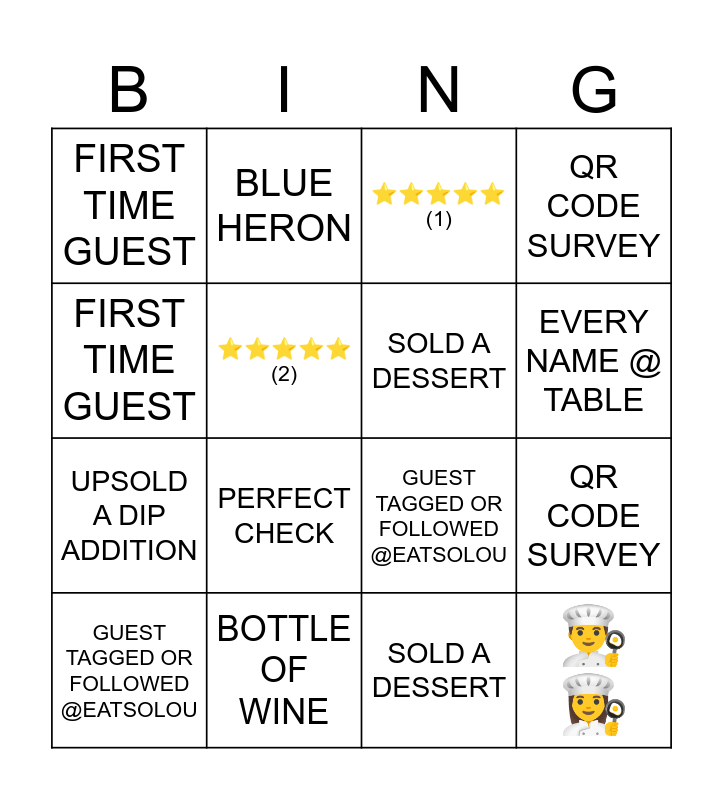 This bingo card has 16 words: BOTTLE OF WINE, QR CODE SURVEY, ⭐⭐⭐⭐⭐ (1), FIRST TIME GUEST, UPSOLD A DIP ADDITION, BLUE HERON, GUEST TAGGED OR FOLLOWED @EATSOLOU, SOLD A DESSERT, FIRST TIME GUEST, ⭐⭐⭐⭐⭐ (2), GUEST TAGGED OR FOLLOWED @EATSOLOU, QR CODE SURVEY, PERFECT CHECK, EVERY NAME @ TABLE, SOLD A DESSERT and 👨🍳👩🍳.
