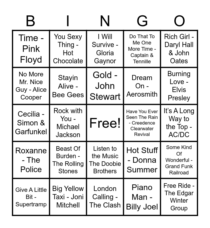 This bingo card has a free space and 84 words: Evil Woman - Electric Light Orchestra, Me and Mrs. Jones - Billy Paul, I Will Survive - Gloria Gaynor, Best of My Love - The Emotions, Runnin' with the Devil - Van Halen, Sweet Home Alabama - Lynyrd Skynyrd, Me and Bobby McGee - Janis Joplin, Sundown - Gordon Lightfoot, That's the Way (I Like It) - K & The Sunshine Band, How Sweet It Is - James Taylor, War - Edwin Starr, Heart of Gold - Neil Young, Stayin Alive - Bee Gees, Have You Ever Seen The Rain - Creedence Clearwater Revival, Barracuda - Heart, Time - Pink Floyd, Give A Little Bit - Supertramp, No More Mr. Nice Guy - Alice Cooper, Don't Stop Me Now - Queen, No Sugar Tonight - The Guess Who, Hooked On A Feeling - Blue Swede, Dream On - Aerosmith, Free Ride - The Edgar Winter Group, I Can See Clearly Now - Johnny Nash, Rock with You - Michael Jackson, Cold as Ice - Foreigner, Without You - Harry Nilsson, Iron Man - Black Sabbath, It's A Man's Man's Man's World - James Brown, Jolene - Dolly Parton, Beast Of Burden - The Rolling Stones, Voulez-Vous - ABBA, Vincent - Don McLean, Cecilia - Simon & Garfunkel, I Was Made For Lovin' You - KISS, September - Earth Wind & Fire, London Calling - The Clash, I Am Woman - Helen Reddy, Burning Love - Elvis Presley, Roxanne - The Police, The Night the Lights Went Out - Vicki Lawrence, Ain’t No Sunshine - Bill Weathers, Crocodile Rock - Elton John, Get Up Stand Up - The Wailers, Stuck In The Middle With You - Stealers Wheel, Carry on Wayward Son - Kansas, You Sexy Thing - Hot Chocolate, (Don’t Fear) The Reaper - Blue Öyster Cult, Takin’ Care of Business - Bachman-Turner Overdrive, Superstition - Stevie Wonder, Baba O'Riley - The Who, Hot Stuff - Donna Summer, Do That To Me One More Time - Captain & Tennille, Dreams - Fleetwood Mac, I Wanna Be Sedated - Ramones, Immigrant Song - Led Zeppelin, Big Yellow Taxi - Joni Mitchell, Gold - John Stewart, Y.M.C.A. - Village People, It’s A Long Way to the Top - AC/DC, Ring My Bell - Anita Ward, More Than A Feeling - Boston, You Make Me Feel Like Dancing - Leo Sayer, O-o-h Child - The Five Stairsteps, Everyday People - Sly & The Family Stone, Top Of The World - Carpenters, My Sweet Lord - George Harrison, Low Rider - War, Rich Girl - Daryl Hall & John Oates, Bad Bad Leroy Brown - Jim Croce, Some Kind Of Wonderful - Grand Funk Railroad, Gypsys Tramps & Thieves - Cher, One Way Or Another - Blondie, АВС - The Jackson 5, Listen to the Music The Doobie Brothers, Piano Man - Billy Joel, Hold the Line - TOTO, Hotel California - Eagles, It’s Too Late - Carole King, Ooh La La - Faces, Come and Get Your Love - Redbone, Midnight Train to Georgia - Gladys Knight & The Pips, Let It Be - The Beatles and You’re so Vain - Carly Simon.