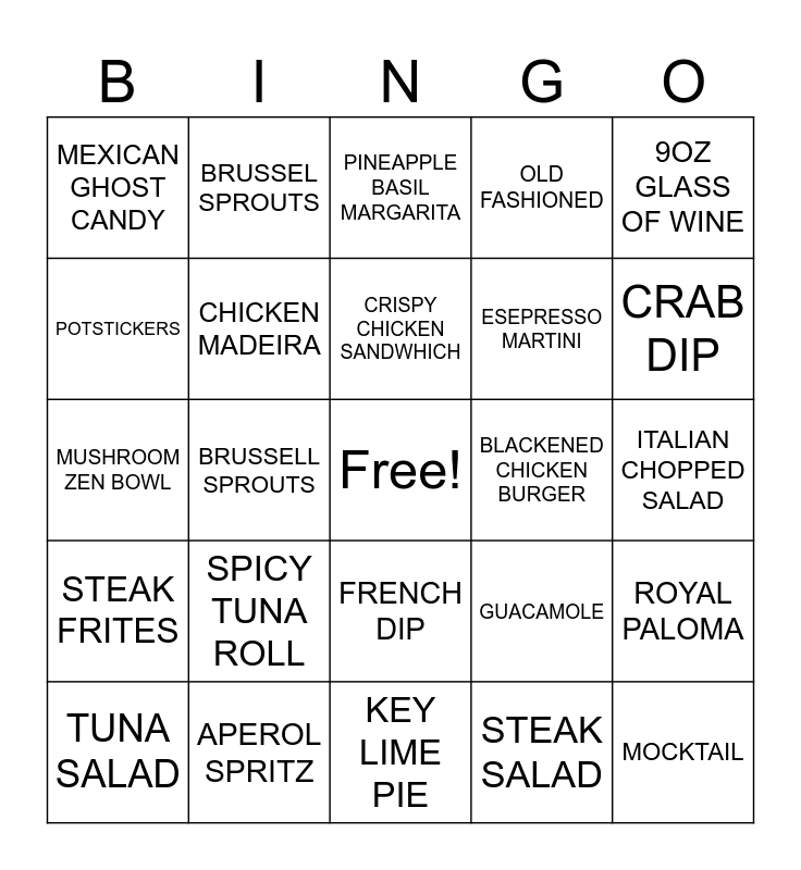 This bingo card has a free space and 24 words: SPICY TUNA ROLL, APEROL SPRITZ, CRISPY CHICKEN SANDWHICH, TUNA SALAD, 9OZ GLASS OF WINE, MEXICAN GHOST CANDY, POTSTICKERS, BRUSSEL SPROUTS, BLACKENED CHICKEN BURGER, FRENCH DIP, ESEPRESSO MARTINI, MUSHROOM ZEN BOWL, GUACAMOLE, ROYAL PALOMA, CHICKEN MADEIRA, STEAK SALAD, ITALIAN CHOPPED SALAD, PINEAPPLE BASIL MARGARITA, CRAB DIP, BRUSSELL SPROUTS, MOCKTAIL, STEAK FRITES, OLD FASHIONED and KEY LIME PIE.
