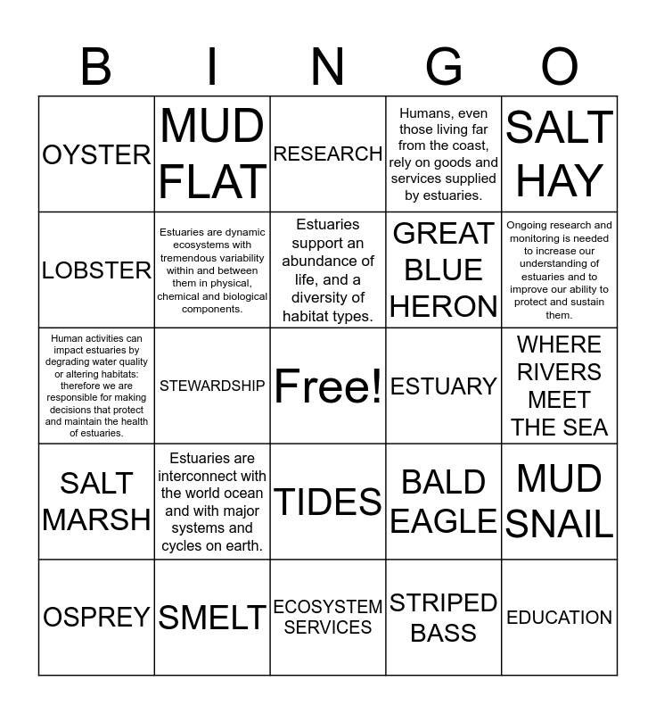 This bingo card has a free space and 24 words: Estuaries are interconnect with the world ocean and with major systems and cycles on earth., SMELT, Estuaries support an abundance of life, and a diversity of habitat types., OSPREY, SALT HAY, OYSTER, LOBSTER, MUD FLAT, ESTUARY, TIDES, GREAT BLUE HERON, Human activities can impact estuaries by degrading water quality or altering habitats: therefore we are responsible for making decisions that protect and maintain the health of estuaries., BALD EAGLE, MUD SNAIL, Estuaries are dynamic ecosystems with tremendous variability within and between them in physical, chemical and biological components., STRIPED BASS, WHERE RIVERS MEET THE SEA, RESEARCH, Ongoing research and monitoring is needed to increase our understanding of estuaries and to improve our ability to protect and sustain them., STEWARDSHIP, EDUCATION, SALT MARSH, Humans, even those living far from the coast, rely on goods and services supplied by estuaries. and ECOSYSTEM SERVICES.