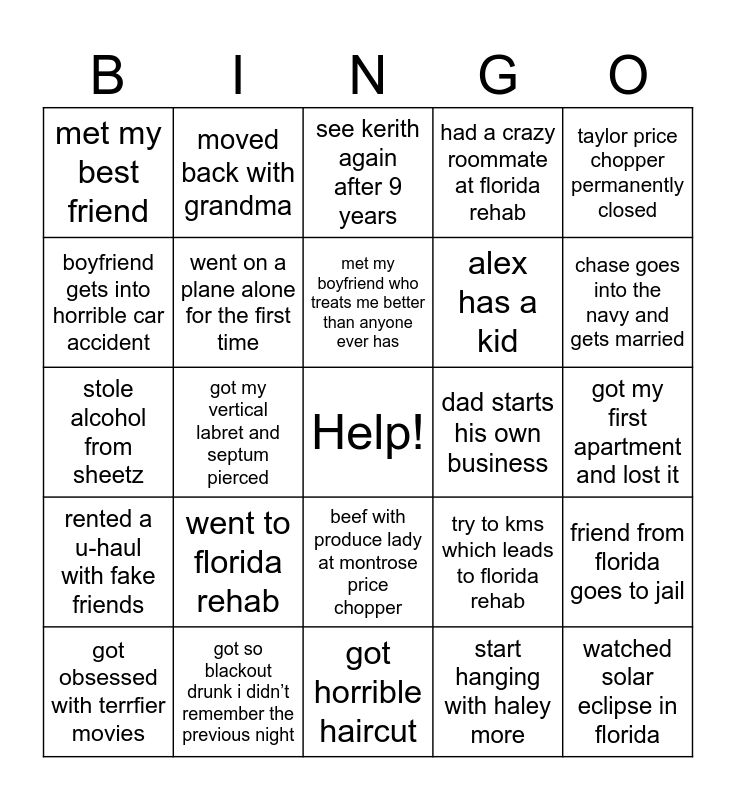 This bingo card has a free space and 24 words: went to florida rehab, got so blackout drunk i didn’t remember the previous night, met my boyfriend who treats me better than anyone ever has, got obsessed with terrfier movies, taylor price chopper permanently closed, met my best friend, boyfriend gets into horrible car accident, moved back with grandma, dad starts his own business, beef with produce lady at montrose price chopper, alex has a kid, stole alcohol from sheetz, try to kms which leads to florida rehab, friend from florida goes to jail, went on a plane alone for the first time, start hanging with haley more, got my first apartment and lost it, see kerith again after 9 years, chase goes into the navy and gets married, got my vertical labret and septum pierced, watched solar eclipse in florida, rented a u-haul with fake friends, had a crazy roommate at florida rehab and got horrible haircut.