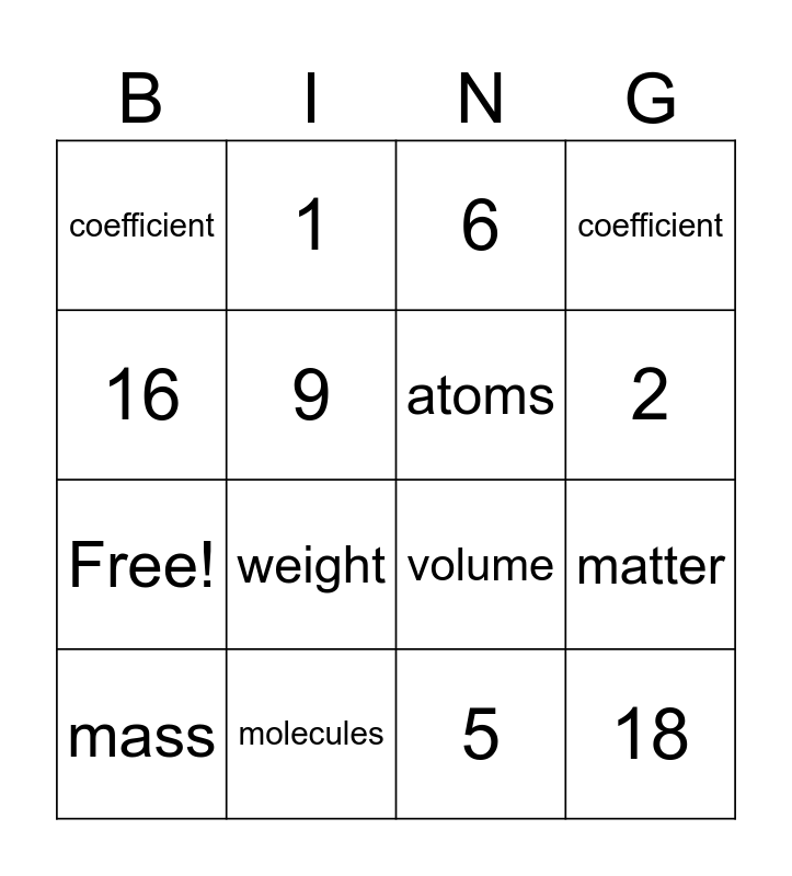 This bingo card has 20 words: matter, 4, 6, 11, mass, 16, molecules, coefficient, Free!, 1, weight, volume, 9, 18, atoms, subscript, 2, coefficient, 5 and 14.