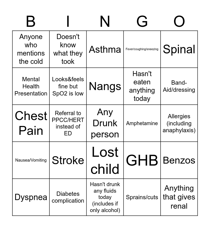 This bingo card has a free space and 24 words: Stroke, Diabetes complication, Nangs, Dyspnea, Spinal, Anyone who mentions the cold, Mental Health Presentation, Doesn't know what they took, Amphetamine, Lost child, Hasn't eaten anything today, Chest Pain, GHB, Benzos, Looks&feels fine but SpO2 is low, Sprains/cuts, Allergies (including anaphylaxis), Asthma, Band-Aid/dressing, Referral to PPCC/HERT instead of ED, Anything that gives renal, Nausea/Vomiting, Fever/coughing/sneezing and Hasn't drunk any fluids today (includes if only alcohol).