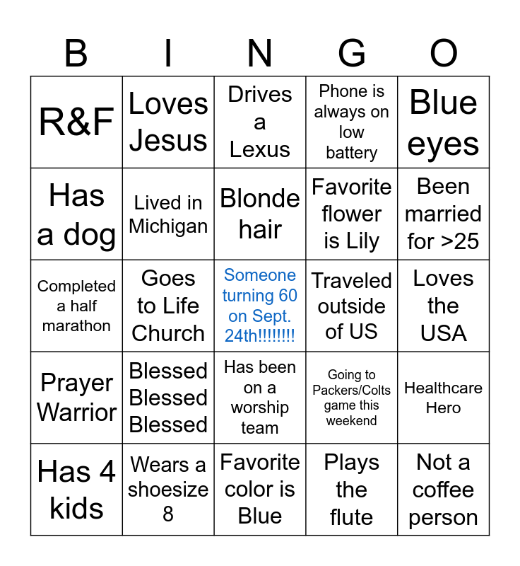 This bingo card has a free space and 24 words: Blessed Blessed Blessed, Wears a shoesize 8, Blonde hair, Has 4 kids, Blue eyes, R&F, Has a dog, Loves Jesus, Traveled outside of US, Has been on a worship team, Favorite flower is Lily, Completed a half marathon, Going to Packers/Colts game this weekend, Healthcare Hero, Lived in Michigan, Plays the flute, Loves the USA, Drives a Lexus, Been married for >25, Goes to Life Church, Not a coffee person, Prayer Warrior, Phone is always on low battery and Favorite color is Blue.