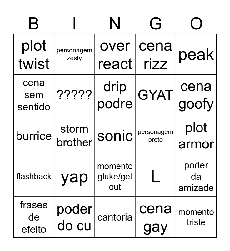 This bingo card has a free space and 29 words: frases de efeito, cringe, cantoria, cena gay, peak, cena sem sentido, personagem zesty, lgbt, personagem preto, momento triste, burrice, ?????, W, L, plot armor, zoom nos pés, storm brother, momento gluke/get out, cena rizz, poder da amizade, flashback, poder do cu, drip podre, GYAT, cena goofy, plot twist, yap, over react and crash out.
