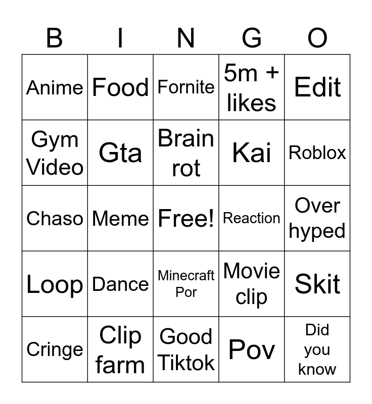 This bingo card has a free space and 24 words: Dance, Clip farm, Brain rot, Cringe, Edit, Anime, Gym Video, Food, Reaction, Minecraft Por, Kai, Chaso, Movie clip, Skit, Gta, Pov, Over hyped, Fornite, Roblox, Meme, Did you know, Loop, 5m + likes and Good Tiktok.
