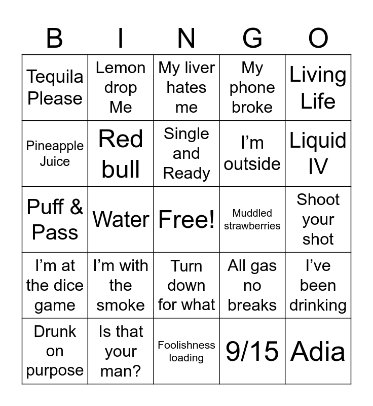 This bingo card has a free space and 24 words: I’m with the smoke, Is that your man?, Single and Ready, Drunk on purpose, Living Life, Tequila Please, Pineapple Juice, Lemon drop Me, Muddled strawberries, Turn down for what, I’m outside, Puff & Pass, All gas no breaks, I’ve been drinking, Red bull, 9/15, Shoot your shot, My liver hates me, Liquid IV, Water, Adia, I’m at the dice game, My phone broke and Foolishness loading.