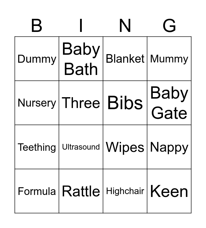 This bingo card has 29 words: Baby, Bottle, Nappy, Pram, Dummy, Blanket, Bibs, Crib, Rattle, Kristina, Highchair, Formula, Swaddle, Car Seat, Ultrasound, Maternity, Weaning, Keen, Nursery, Wipes, Breast Pump, Muslin, Teething, Three, Mummy, Baby Bath, Lullaby, Baby Gate and Newborn.