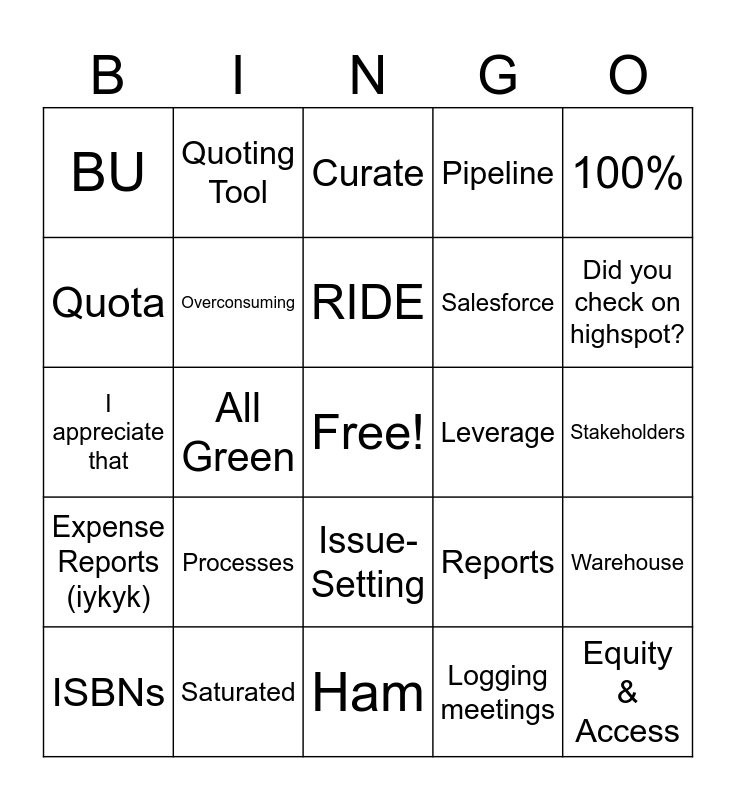 This bingo card has a free space and 30 words: Saturated, Funding Cliff, All Green, One-pager, BU, Curate, Overconsuming, Issue-Setting, Leverage, Ham, Stakeholders, Equity & Access, Logging meetings, Ask a specialist, Did you check on highspot?, Plaid Phonics, Reports, Expense Reports (iykyk), Processes, 100%, I appreciate that, A one time exception, Quoting Tool, Salesforce, Quota, Pipeline, Warehouse, ISBNs, RIDE and AP&E/CTE.