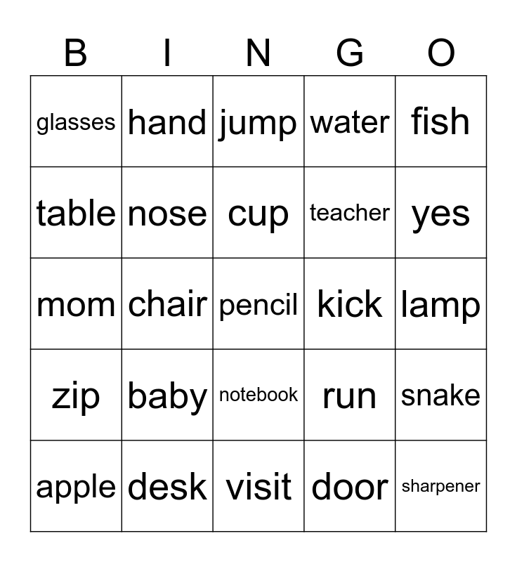 This bingo card has a free space and 24 words: apple, baby, cup, door, fish, glasses, hand, jump, kick, lamp, mom, nose, run, snake, table, desk, visit, water, yes, zip, chair, notebook, teacher and sharpener.