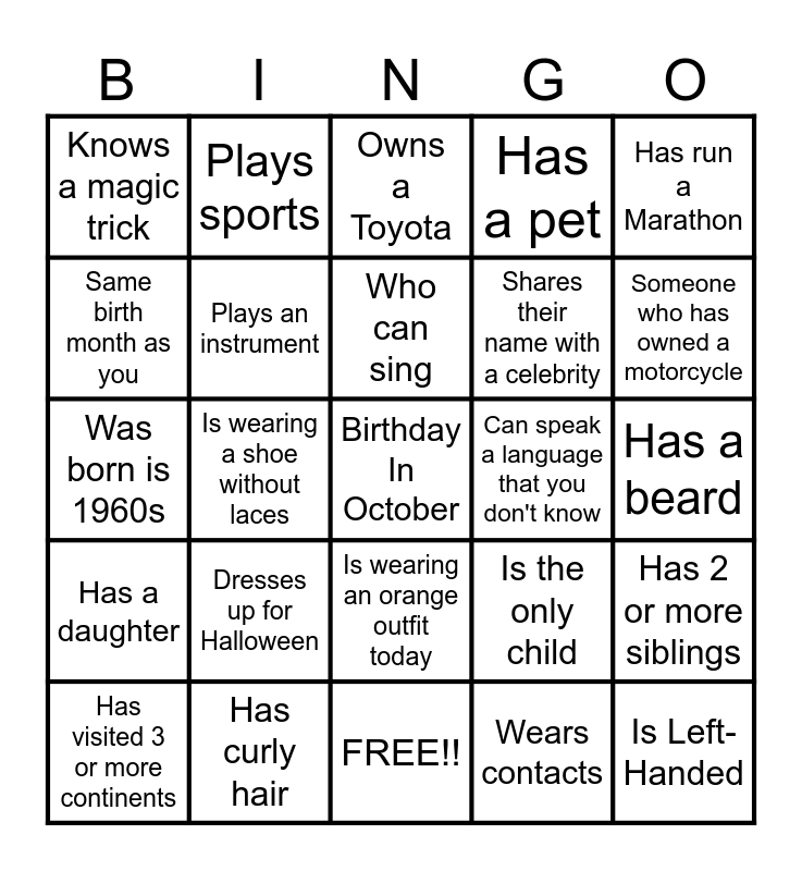 This bingo card has 25 words: Has a daughter, Has curly hair, Birthday In October, Wears contacts, Has run a Marathon, Knows a magic trick, Plays sports, Owns a Toyota, Can speak a language that you don't know, Has 2 or more siblings, Same birth month as you, Plays an instrument, FREE!!, Is the only child, Someone who has owned a motorcycle, Has visited 3 or more continents, Is wearing a shoe without laces, Who can sing, Shares their name with a celebrity, Has a beard, Was born is 1960s, Dresses up for Halloween, Is wearing an orange outfit today, Has a pet and Is Left-Handed.
