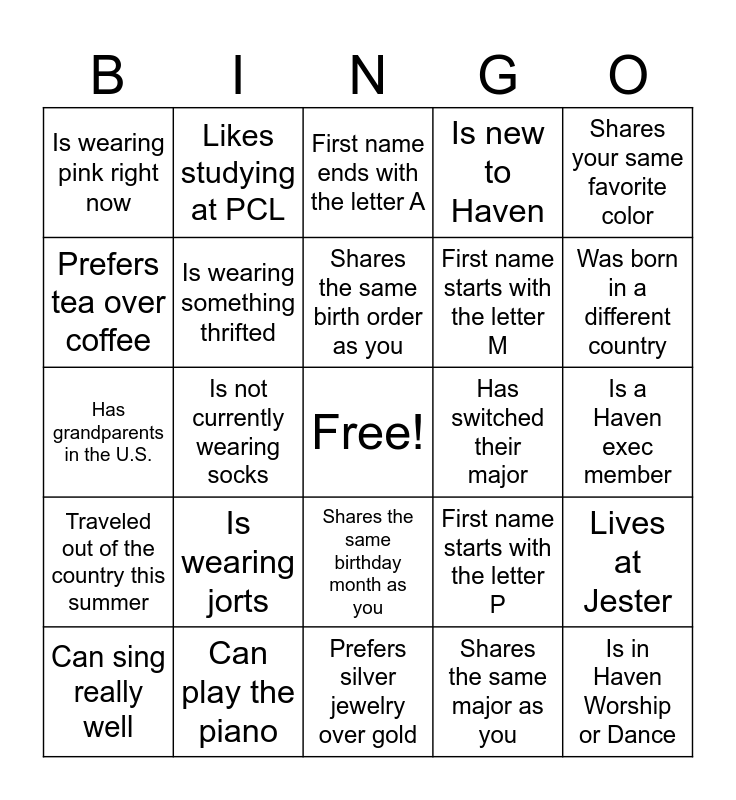 This bingo card has a free space and 26 words: Shares the same birthday month as you, Shares the same major as you, Shares the same birth order as you, Can play the piano, Shares your same favorite color, Is wearing pink right now, Prefers tea over coffee, Likes studying at PCL, Is a Haven exec member, First name starts with the letter P, First name starts with the letter M, Has grandparents in the U.S., Lives at Jester, Can sing really well, Is not currently wearing socks, Has been in Haven since their freshman year, Is new to Haven, Traveled out of the country this summer, First name ends with the letter A, Is in Haven Worship or Dance, Was born in a different country, Prefers silver jewelry over gold, Has switched their major, Is wearing jorts, Is wearing something thrifted and Has at least 3 rings on.