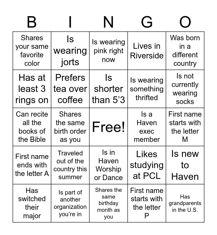 This bingo card has a free space and 31 words: Shares the same birthday month as you, Shares the same major as you, Shares the same birth order as you, Can play the piano, Shares your same favorite color, Is wearing pink right now, Prefers tea over coffee, Likes studying at PCL, Is a Haven exec member, First name starts with the letter P, First name starts with the letter M, Has grandparents in the U.S., Lives at Jester, Can sing really well, Is not currently wearing socks, Has been in Haven since their freshman year, Is new to Haven, Traveled out of the country this summer, First name ends with the letter A, Is in Haven Worship or Dance, Was born in a different country, Prefers silver jewelry over gold, Has switched their major, Is wearing jorts, Is wearing something thrifted, Has at least 3 rings on, Lives in Riverside, Can recite all the books of the Bible, Is part of another organization you’re in, Is shorter than 5’3 and Is taller than 6’2.