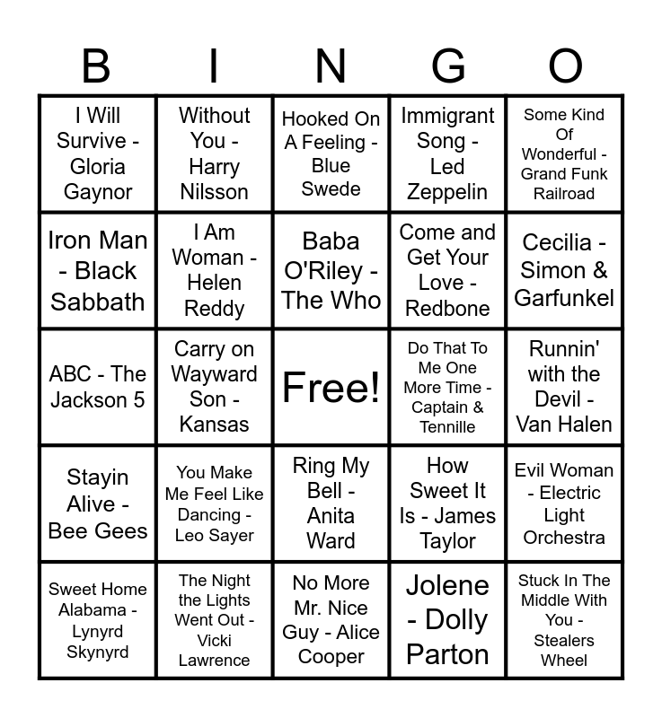This bingo card has a free space and 84 words: Everyday People - Sly & The Family Stone, One Way Or Another - Blondie, Hooked On A Feeling - Blue Swede, No Sugar Tonight - The Guess Who, You Sexy Thing - Hot Chocolate, Me and Mrs. Jones - Billy Paul, Low Rider - War, Y.M.C.A. - Village People, Big Yellow Taxi - Joni Mitchell, Listen to the Music The Doobie Brothers, September - Earth Wind & Fire, It’s A Long Way to the Top - AC/DC, I Am Woman - Helen Reddy, Do That To Me One More Time - Captain & Tennille, Get Up Stand Up - The Wailers, I Will Survive - Gloria Gaynor, Sweet Home Alabama - Lynyrd Skynyrd, Iron Man - Black Sabbath, I Was Made For Lovin' You - KISS, Hot Stuff - Donna Summer, Burning Love - Elvis Presley, Come and Get Your Love - Redbone, Stuck In The Middle With You - Stealers Wheel, Dream On - Aerosmith, Carry on Wayward Son - Kansas, Hotel California - Eagles, Free Ride - The Edgar Winter Group, Don't Stop Me Now - Queen, I Wanna Be Sedated - Ramones, Gypsys Tramps & Thieves - Cher, You Make Me Feel Like Dancing - Leo Sayer, O-o-h Child - The Five Stairsteps, Best of My Love - The Emotions, АВС - The Jackson 5, I Can See Clearly Now - Johnny Nash, Top Of The World - Carpenters, No More Mr. Nice Guy - Alice Cooper, Crocodile Rock - Elton John, Cecilia - Simon & Garfunkel, Stayin Alive - Bee Gees, Gold - John Stewart, Hold the Line - TOTO, Ain’t No Sunshine - Bill Weathers, You’re so Vain - Carly Simon, Ooh La La - Faces, Superstition - Stevie Wonder, Without You - Harry Nilsson, Roxanne - The Police, More Than A Feeling - Boston, It’s Too Late - Carole King, Time - Pink Floyd, How Sweet It Is - James Taylor, Immigrant Song - Led Zeppelin, Barracuda - Heart, Let It Be - The Beatles, Rock with You - Michael Jackson, The Night the Lights Went Out - Vicki Lawrence, Baba O'Riley - The Who, Piano Man - Billy Joel, Runnin' with the Devil - Van Halen, Takin’ Care of Business - Bachman-Turner Overdrive, War - Edwin Starr, My Sweet Lord - George Harrison, It's A Man's Man's Man's World - James Brown, Heart of Gold - Neil Young, Have You Ever Seen The Rain - Creedence Clearwater Revival, Dreams - Fleetwood Mac, Midnight Train to Georgia - Gladys Knight & The Pips, Some Kind Of Wonderful - Grand Funk Railroad, (Don’t Fear) The Reaper - Blue Öyster Cult, Evil Woman - Electric Light Orchestra, Rich Girl - Daryl Hall & John Oates, Bad Bad Leroy Brown - Jim Croce, Sundown - Gordon Lightfoot, Ring My Bell - Anita Ward, Jolene - Dolly Parton, London Calling - The Clash, Me and Bobby McGee - Janis Joplin, That's the Way (I Like It) - K & The Sunshine Band, Beast Of Burden - The Rolling Stones, Voulez-Vous - ABBA, Give A Little Bit - Supertramp, Cold as Ice - Foreigner and Vincent - Don McLean.