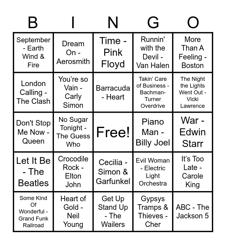 This bingo card has a free space and 84 words: That's the Way (I Like It) - K & The Sunshine Band, It’s A Long Way to the Top - AC/DC, Time - Pink Floyd, O-o-h Child - The Five Stairsteps, My Sweet Lord - George Harrison, Low Rider - War, Big Yellow Taxi - Joni Mitchell, Cold as Ice - Foreigner, Have You Ever Seen The Rain - Creedence Clearwater Revival, Me and Bobby McGee - Janis Joplin, I Can See Clearly Now - Johnny Nash, Bad Bad Leroy Brown - Jim Croce, You’re so Vain - Carly Simon, Piano Man - Billy Joel, Hot Stuff - Donna Summer, September - Earth Wind & Fire, Some Kind Of Wonderful - Grand Funk Railroad, London Calling - The Clash, Give A Little Bit - Supertramp, Jolene - Dolly Parton, Listen to the Music The Doobie Brothers, Takin’ Care of Business - Bachman-Turner Overdrive, АВС - The Jackson 5, I Was Made For Lovin' You - KISS, No Sugar Tonight - The Guess Who, Ain’t No Sunshine - Bill Weathers, Vincent - Don McLean, Ring My Bell - Anita Ward, Without You - Harry Nilsson, Hold the Line - TOTO, Crocodile Rock - Elton John, Midnight Train to Georgia - Gladys Knight & The Pips, No More Mr. Nice Guy - Alice Cooper, Don't Stop Me Now - Queen, Superstition - Stevie Wonder, Hooked On A Feeling - Blue Swede, Get Up Stand Up - The Wailers, Carry on Wayward Son - Kansas, The Night the Lights Went Out - Vicki Lawrence, Let It Be - The Beatles, You Sexy Thing - Hot Chocolate, I Wanna Be Sedated - Ramones, Free Ride - The Edgar Winter Group, Immigrant Song - Led Zeppelin, I Am Woman - Helen Reddy, Do That To Me One More Time - Captain & Tennille, Dream On - Aerosmith, Gold - John Stewart, Sweet Home Alabama - Lynyrd Skynyrd, (Don’t Fear) The Reaper - Blue Öyster Cult, Ooh La La - Faces, Evil Woman - Electric Light Orchestra, Runnin' with the Devil - Van Halen, One Way Or Another - Blondie, Y.M.C.A. - Village People, Stuck In The Middle With You - Stealers Wheel, Heart of Gold - Neil Young, Barracuda - Heart, Roxanne - The Police, War - Edwin Starr, Voulez-Vous - ABBA, Beast Of Burden - The Rolling Stones, How Sweet It Is - James Taylor, Me and Mrs. Jones - Billy Paul, Burning Love - Elvis Presley, Rock with You - Michael Jackson, Iron Man - Black Sabbath, It's A Man's Man's Man's World - James Brown, More Than A Feeling - Boston, Stayin Alive - Bee Gees, It’s Too Late - Carole King, Baba O'Riley - The Who, Hotel California - Eagles, Come and Get Your Love - Redbone, Cecilia - Simon & Garfunkel, Gypsys Tramps & Thieves - Cher, Rich Girl - Daryl Hall & John Oates, Top Of The World - Carpenters, Everyday People - Sly & The Family Stone, You Make Me Feel Like Dancing - Leo Sayer, Dreams - Fleetwood Mac, Sundown - Gordon Lightfoot, I Will Survive - Gloria Gaynor and Best of My Love - The Emotions.